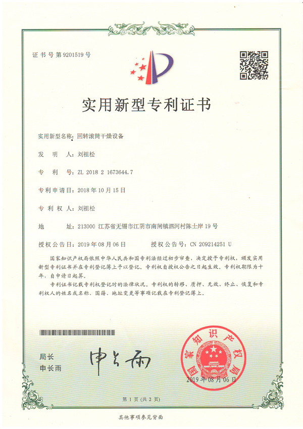 關(guān)鍵詞:常州榮發(fā)干燥申請回轉(zhuǎn)滾筒干燥設(shè)備專利證書成功!